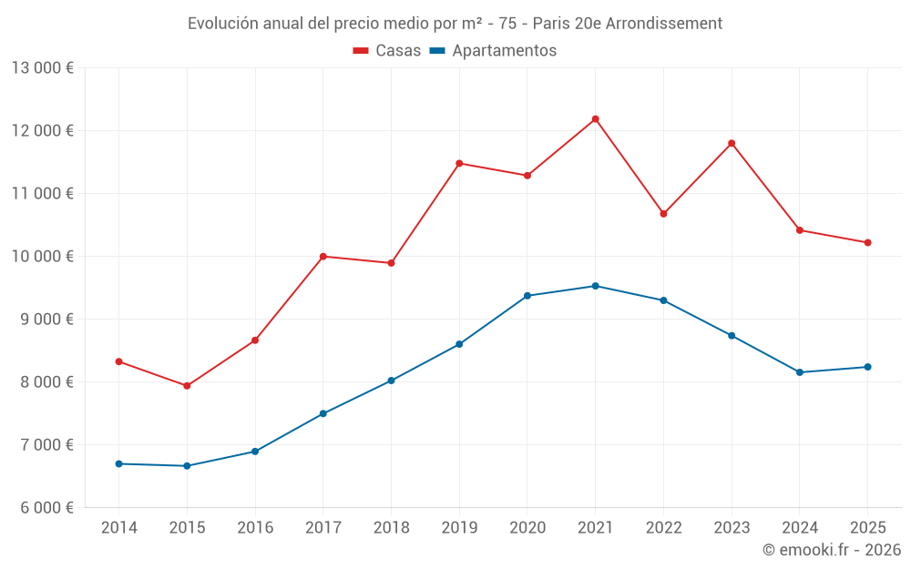 El precio mediano en las 176 transacciones de apartamentos de los últimos 3 meses en la comuna de Paris 20e Arrondissement fue de 7 966 € por metro cuadrado para un valor patrimonial medio de 328 500 €. Durante este período el 60% de las transacciones estuvieron entre 6 536 y 9 286 € por metro cuadrado (del 2º al 8º decil).