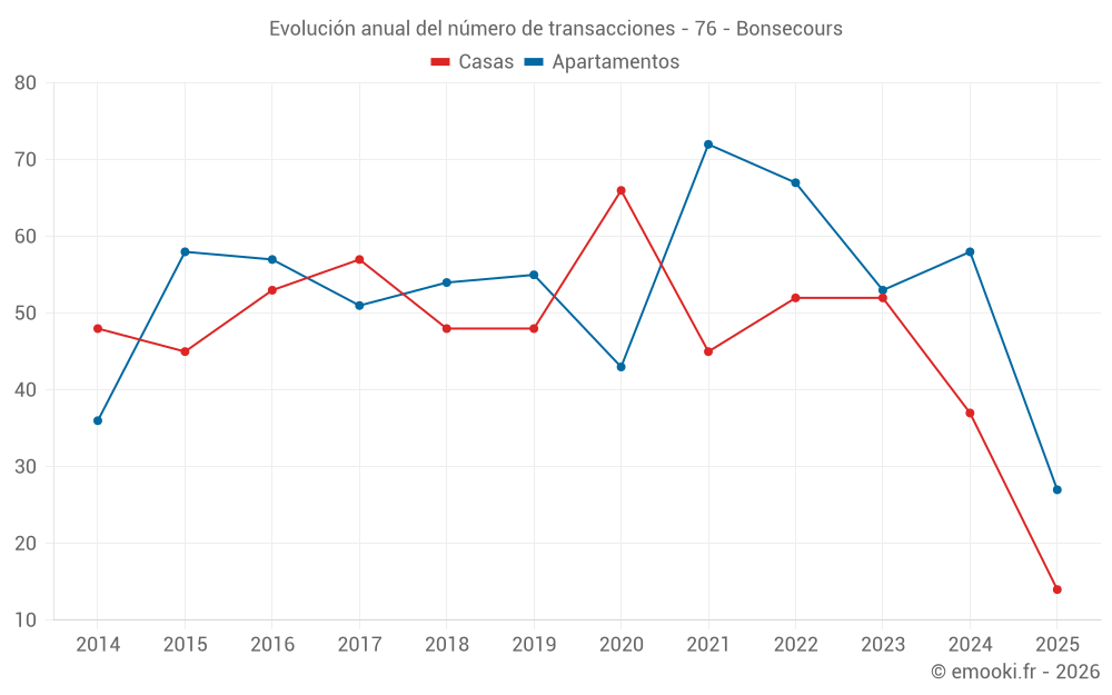 El precio mediano en las 31 transacciones de casas de los últimos 12 meses en la comuna de Bonsecours fue de 2 828 € por metro cuadrado para un valor patrimonial medio de 285 000 €. Durante este período el 60% de las transacciones estuvieron entre 2 357 y 3 326 € por metro cuadrado (del 2º al 8º decil).