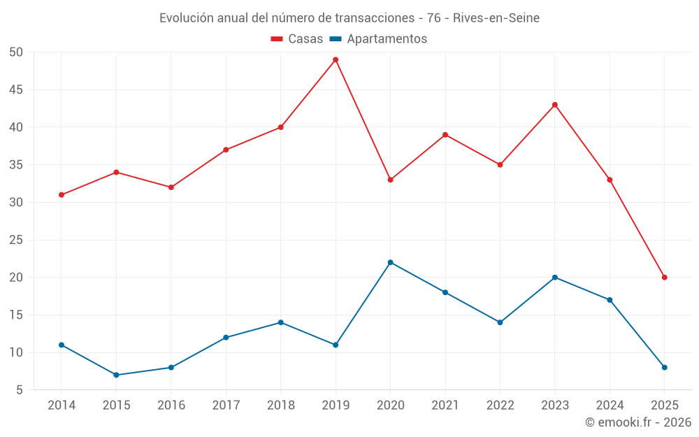 El precio mediano en las 20 transacciones de casas de los últimos 6 meses en la comuna de Rives-en-Seine fue de 1 334 € por metro cuadrado para un valor patrimonial medio de 167 500 €. Durante este período el 60% de las transacciones estuvieron entre 934 y 1 917 € por metro cuadrado (del 2º al 8º decil).