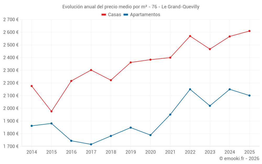 El precio mediano en las 41 transacciones de casas de los últimos 6 meses en la comuna de Le Grand-Quevilly fue de 2 610 € por metro cuadrado para un valor patrimonial medio de 209 300 €. Durante este período el 60% de las transacciones estuvieron entre 2 203 y 2 944 € por metro cuadrado (del 2º al 8º decil).