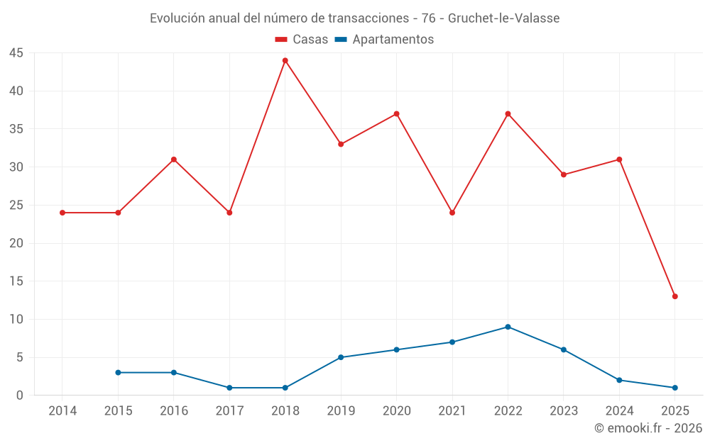 El precio mediano en las 27 transacciones de casas de los últimos 12 meses en la comuna de Gruchet-le-Valasse fue de 2 045 € por metro cuadrado para un valor patrimonial medio de 180 000 €. Durante este período el 60% de las transacciones estuvieron entre 1 624 y 2 298 € por metro cuadrado (del 2º al 8º decil).