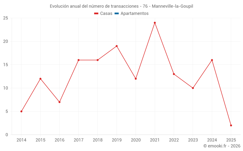 El precio mediano en las 24 transacciones de casas de los últimos 24 meses en la comuna de Manneville-la-Goupil fue de 2 401 € por metro cuadrado para un valor patrimonial medio de 245 000 €. Durante este período el 60% de las transacciones estuvieron entre 1 639 y 2 889 € por metro cuadrado (del 2º al 8º decil).