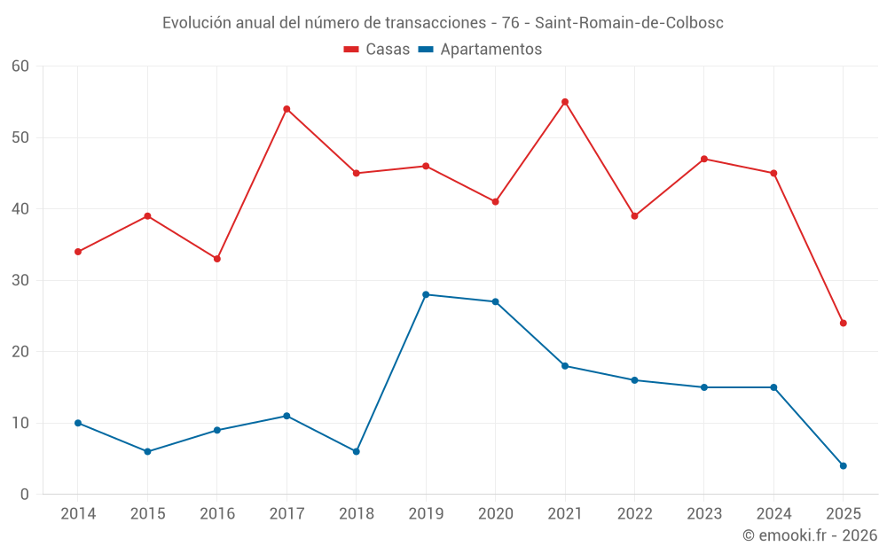 El precio mediano en las 22 transacciones de apartamentos de los últimos 24 meses en la comuna de Saint-Romain-de-Colbosc fue de 2 212 € por metro cuadrado para un valor patrimonial medio de 156 000 €. Durante este período el 60% de las transacciones estuvieron entre 1 977 y 2 684 € por metro cuadrado (del 2º al 8º decil).