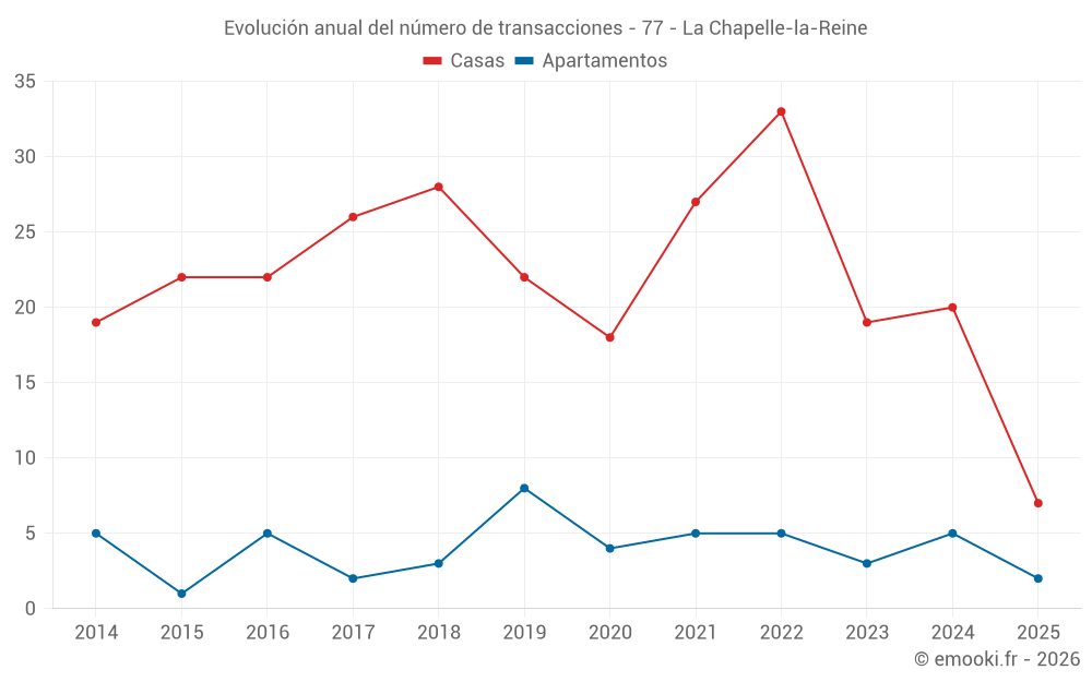 El precio mediano en las 17 transacciones de casas de los últimos 12 meses en la comuna de La Chapelle-la-Reine fue de 2 150 € por metro cuadrado para un valor patrimonial medio de 240 000 €. Durante este período el 60% de las transacciones estuvieron entre 1 828 y 2 855 € por metro cuadrado (del 2º al 8º decil).