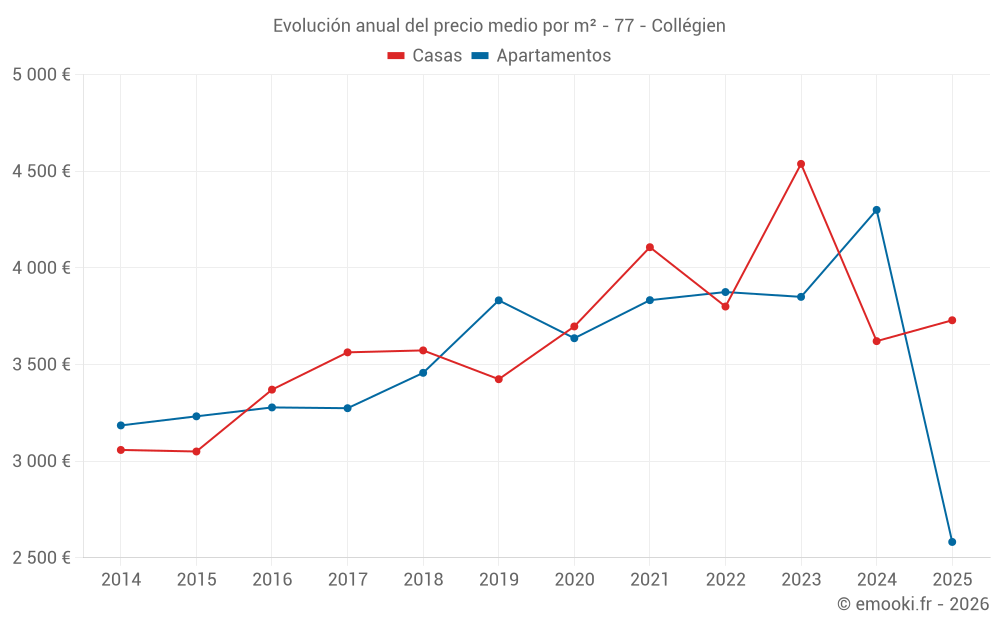 El precio mediano en las 31 transacciones de casas de los últimos 24 meses en la comuna de Collégien fue de 4 023 € por metro cuadrado para un valor patrimonial medio de 399 000 €. Durante este período el 60% de las transacciones estuvieron entre 3 333 y 4 717 € por metro cuadrado (del 2º al 8º decil).