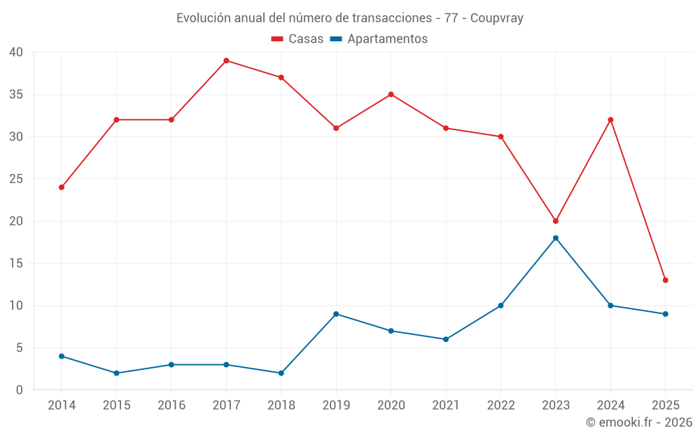 El precio mediano en las 29 transacciones de apartamentos de los últimos 24 meses en la comuna de Coupvray fue de 4 020 € por metro cuadrado para un valor patrimonial medio de 231 000 €. Durante este período el 60% de las transacciones estuvieron entre 3 712 y 4 686 € por metro cuadrado (del 2º al 8º decil).