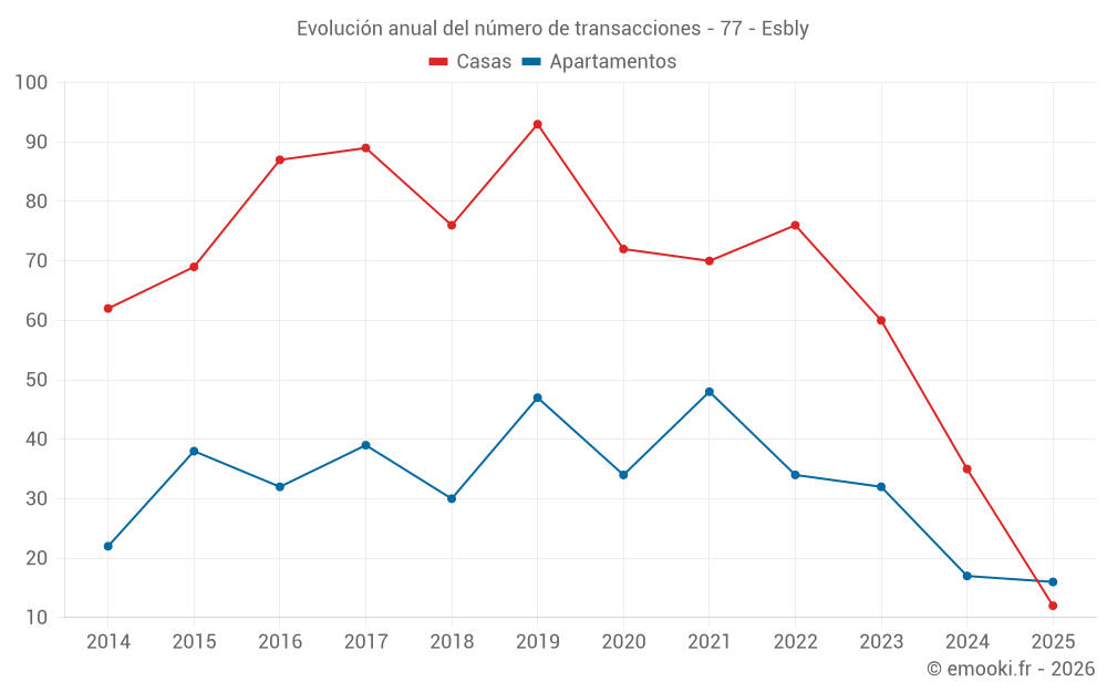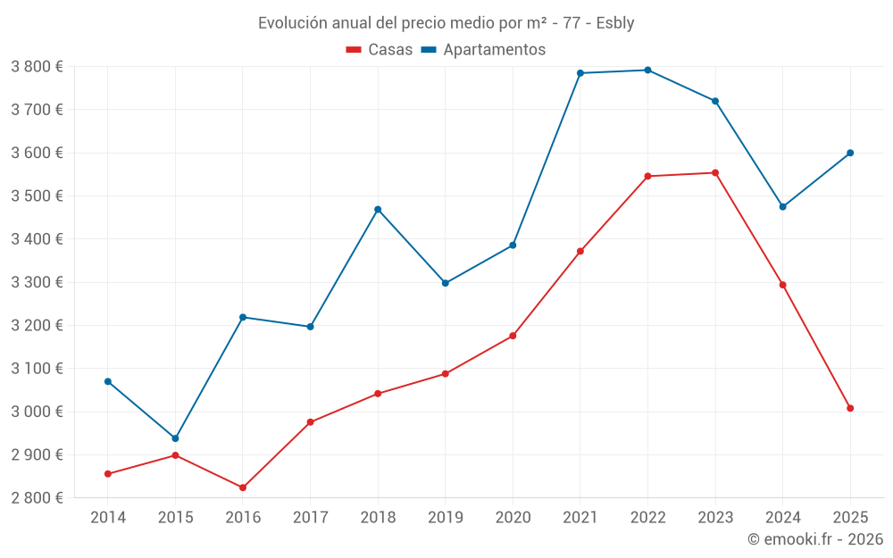 El precio mediano en las 23 transacciones de apartamentos de los últimos 12 meses en la comuna de Esbly fue de 3 705 € por metro cuadrado para un valor patrimonial medio de 152 500 €. Durante este período el 60% de las transacciones estuvieron entre 3 079 y 4 375 € por metro cuadrado (del 2º al 8º decil).