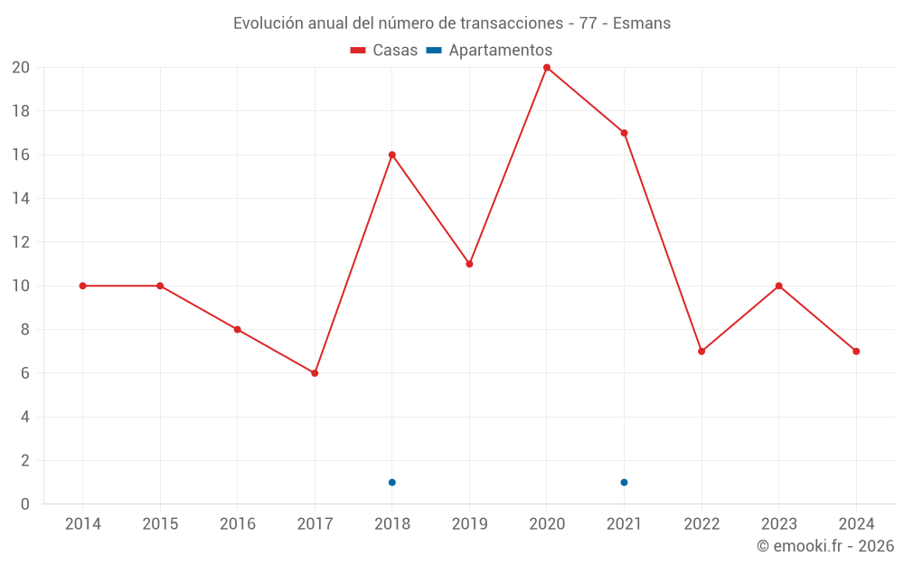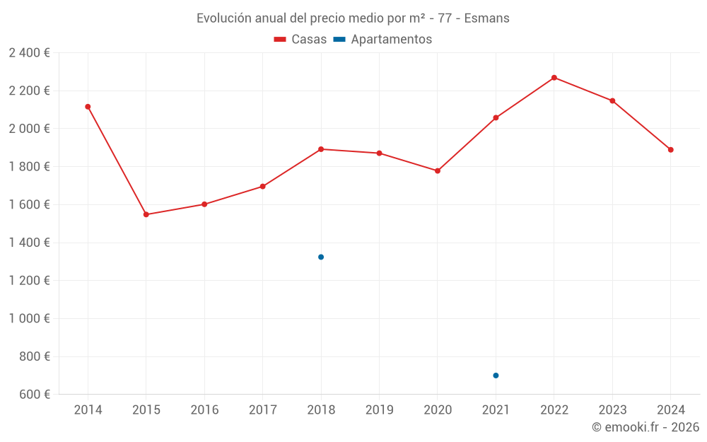 El precio mediano en las 16 transacciones de casas de los últimos 24 meses en la comuna de Esmans fue de 2 018 € por metro cuadrado para un valor patrimonial medio de 164 000 €. Durante este período el 60% de las transacciones estuvieron entre 1 500 y 2 810 € por metro cuadrado (del 2º al 8º decil).