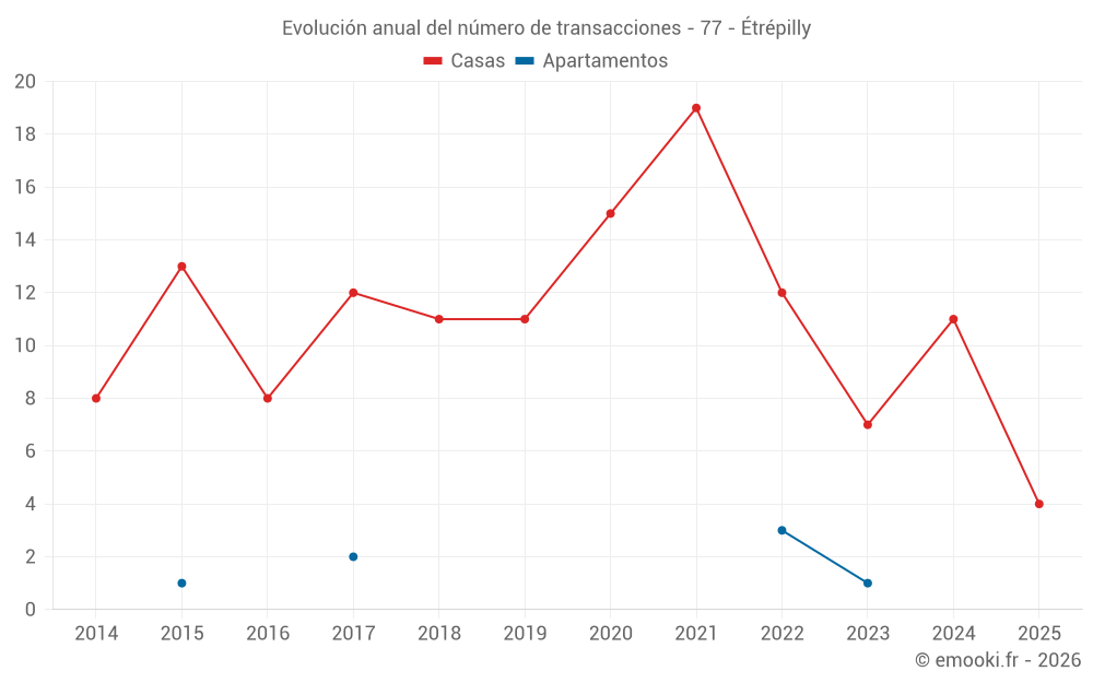 El precio mediano en las 17 transacciones de casas de los últimos 24 meses en la comuna de Étrépilly fue de 2 538 € por metro cuadrado para un valor patrimonial medio de 239 000 €. Durante este período el 60% de las transacciones estuvieron entre 1 800 y 3 168 € por metro cuadrado (del 2º al 8º decil).