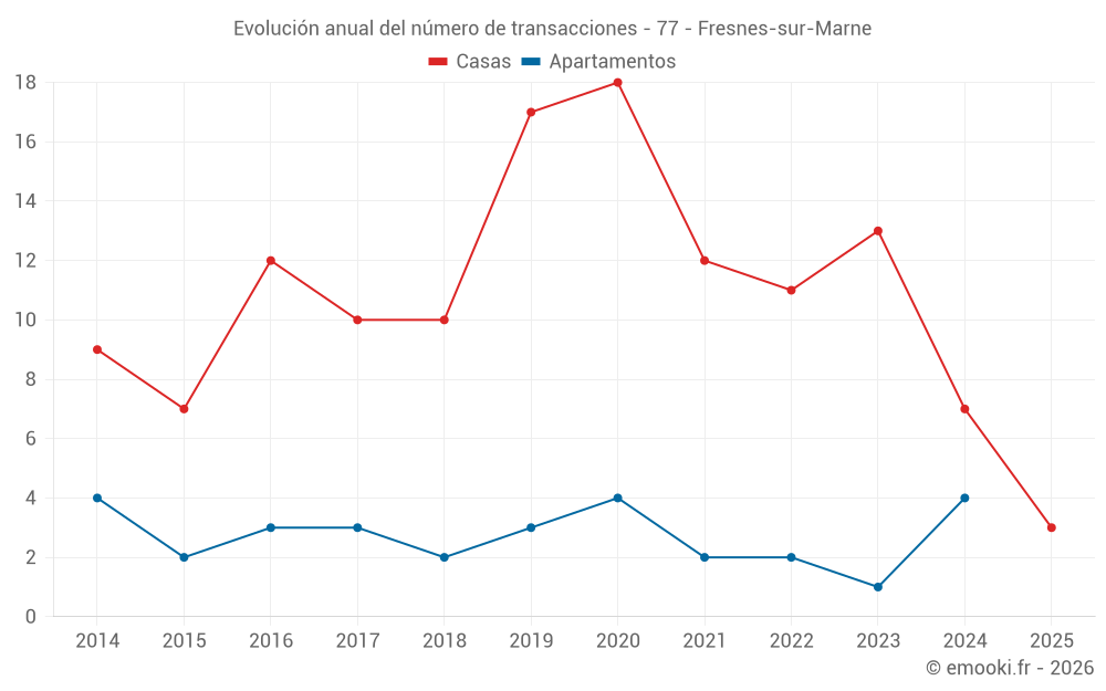 El precio mediano en las 16 transacciones de casas de los últimos 24 meses en la comuna de Fresnes-sur-Marne fue de 3 423 € por metro cuadrado para un valor patrimonial medio de 323 000 €. Durante este período el 60% de las transacciones estuvieron entre 2 857 y 3 926 € por metro cuadrado (del 2º al 8º decil).