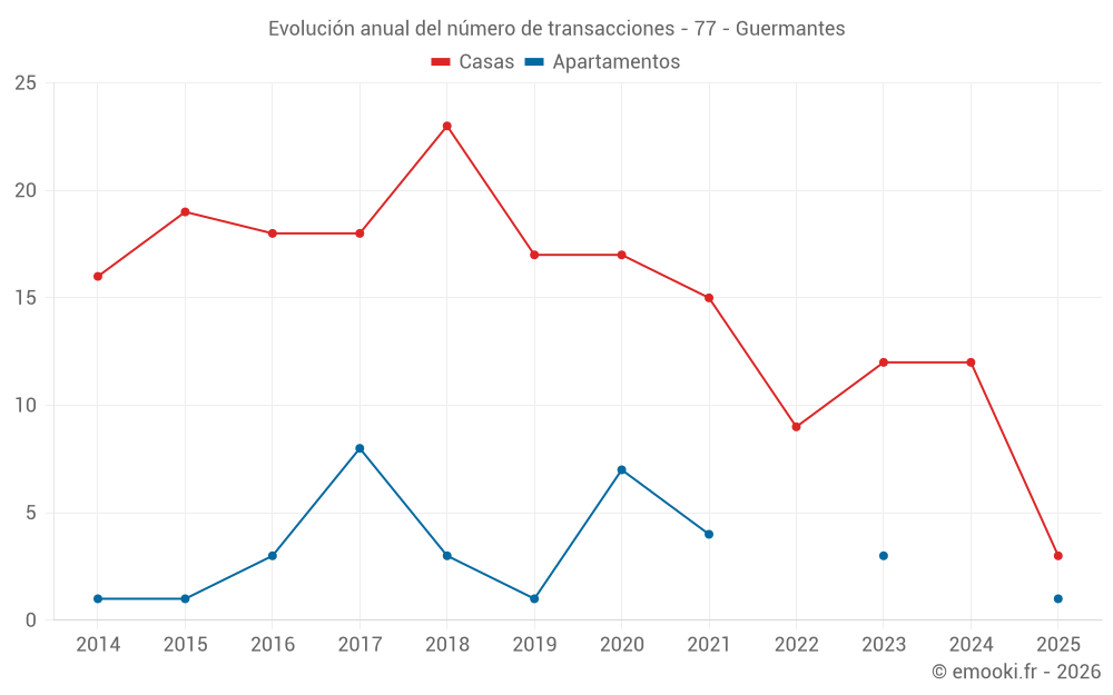 El precio mediano en las 21 transacciones de casas de los últimos 24 meses en la comuna de Guermantes fue de 3 731 € por metro cuadrado para un valor patrimonial medio de 428 000 €. Durante este período el 60% de las transacciones estuvieron entre 3 179 y 4 063 € por metro cuadrado (del 2º al 8º decil).
