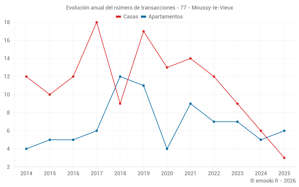 El precio mediano en las 14 transacciones de casas de los últimos 24 meses en la comuna de Moussy-le-Vieux fue de 2 952 € por metro cuadrado para un valor patrimonial medio de 312 500 €. Durante este período el 60% de las transacciones estuvieron entre 2 559 y 3 465 € por metro cuadrado (del 2º al 8º decil).