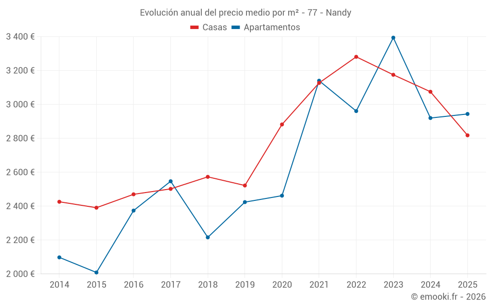 El precio mediano en las 48 transacciones de casas de los últimos 12 meses en la comuna de Nandy fue de 2 894 € por metro cuadrado para un valor patrimonial medio de 271 400 €. Durante este período el 60% de las transacciones estuvieron entre 1 949 y 3 312 € por metro cuadrado (del 2º al 8º decil).