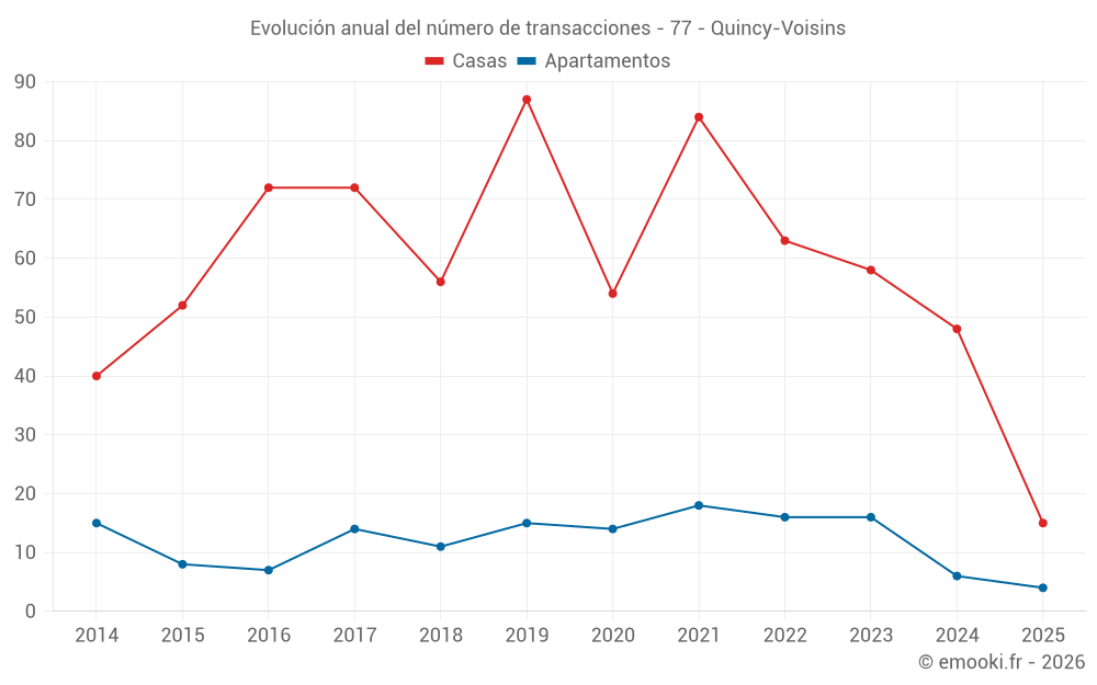 El precio mediano en las 16 transacciones de apartamentos de los últimos 24 meses en la comuna de Quincy-Voisins fue de 3 617 € por metro cuadrado para un valor patrimonial medio de 154 000 €. Durante este período el 60% de las transacciones estuvieron entre 3 317 y 4 250 € por metro cuadrado (del 2º al 8º decil).