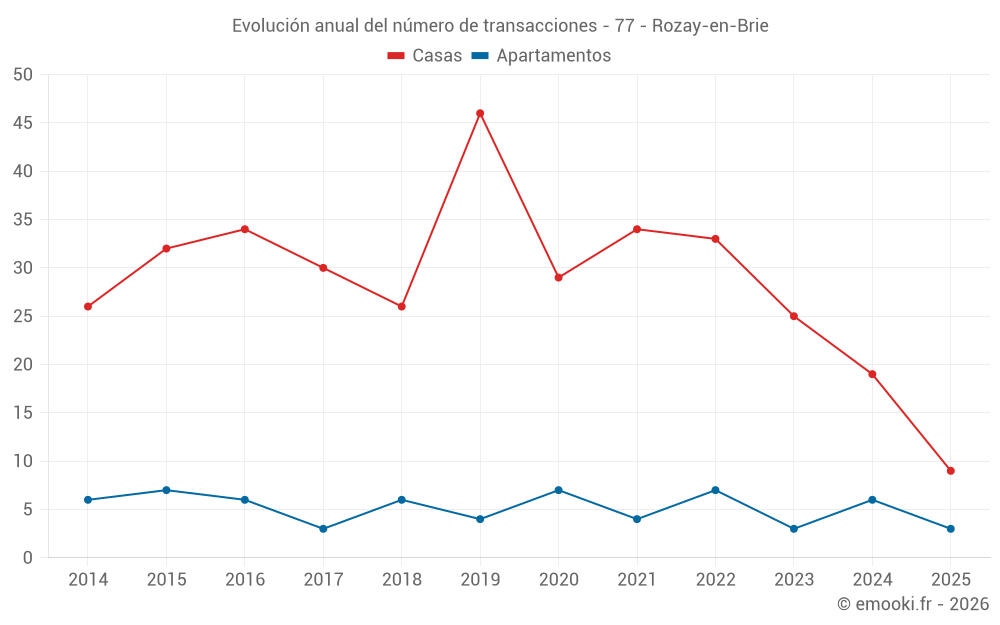El precio mediano en las 23 transacciones de casas de los últimos 12 meses en la comuna de Rozay-en-Brie fue de 2 778 € por metro cuadrado para un valor patrimonial medio de 285 000 €. Durante este período el 60% de las transacciones estuvieron entre 2 357 y 3 000 € por metro cuadrado (del 2º al 8º decil).