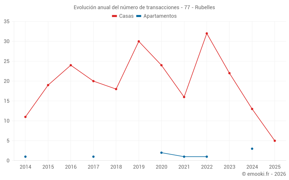 El precio mediano en las 16 transacciones de casas de los últimos 12 meses en la comuna de Rubelles fue de 2 870 € por metro cuadrado para un valor patrimonial medio de 322 500 €. Durante este período el 60% de las transacciones estuvieron entre 2 357 y 3 218 € por metro cuadrado (del 2º al 8º decil).