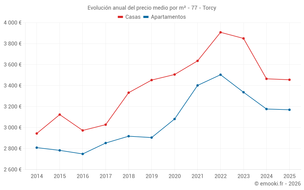 El precio mediano en las 42 transacciones de apartamentos de los últimos 6 meses en la comuna de Torcy fue de 3 170 € por metro cuadrado para un valor patrimonial medio de 189 741 €. Durante este período el 60% de las transacciones estuvieron entre 2 636 y 3 669 € por metro cuadrado (del 2º al 8º decil).