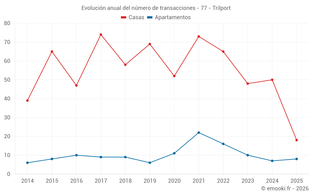 El precio mediano en las 19 transacciones de apartamentos de los últimos 24 meses en la comuna de Trilport fue de 2 871 € por metro cuadrado para un valor patrimonial medio de 142 000 €. Durante este período el 60% de las transacciones estuvieron entre 2 388 y 3 329 € por metro cuadrado (del 2º al 8º decil).