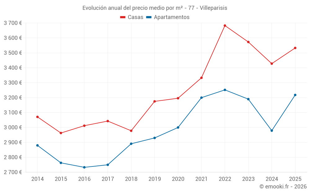 El precio mediano en las 52 transacciones de apartamentos de los últimos 6 meses en la comuna de Villeparisis fue de 3 218 € por metro cuadrado para un valor patrimonial medio de 144 000 €. Durante este período el 60% de las transacciones estuvieron entre 2 373 y 3 871 € por metro cuadrado (del 2º al 8º decil).