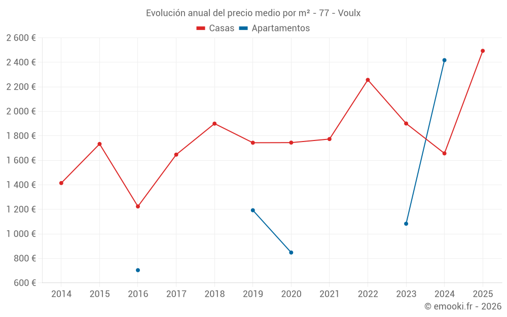 El precio mediano en las 22 transacciones de casas de los últimos 12 meses en la comuna de Voulx fue de 1 878 € por metro cuadrado para un valor patrimonial medio de 169 500 €. Durante este período el 60% de las transacciones estuvieron entre 1 029 y 2 631 € por metro cuadrado (del 2º al 8º decil).