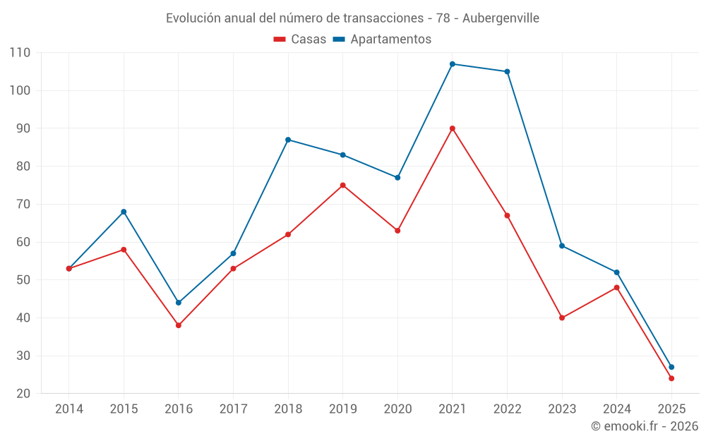 El precio mediano en las 24 transacciones de casas de los últimos 6 meses en la comuna de Aubergenville fue de 3 023 € por metro cuadrado para un valor patrimonial medio de 303 400 €. Durante este período el 60% de las transacciones estuvieron entre 2 462 y 3 456 € por metro cuadrado (del 2º al 8º decil).