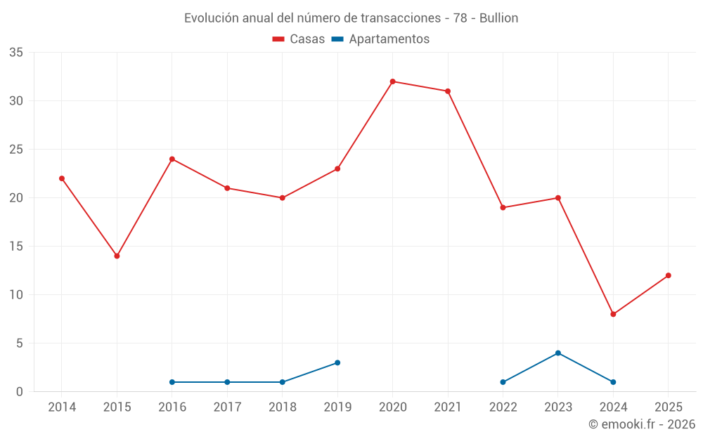 El precio mediano en las 29 transacciones de casas de los últimos 24 meses en la comuna de Bullion fue de 3 221 € por metro cuadrado para un valor patrimonial medio de 320 000 €. Durante este período el 60% de las transacciones estuvieron entre 2 281 y 4 448 € por metro cuadrado (del 2º al 8º decil).