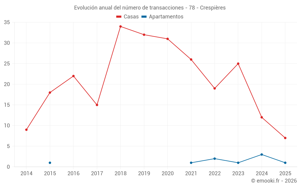 El precio mediano en las 33 transacciones de casas de los últimos 24 meses en la comuna de Crespières fue de 3 963 € por metro cuadrado para un valor patrimonial medio de 546 750 €. Durante este período el 60% de las transacciones estuvieron entre 3 172 y 4 885 € por metro cuadrado (del 2º al 8º decil).