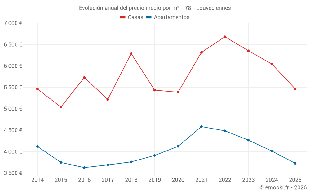 El precio mediano en las 17 transacciones de casas de los últimos 12 meses en la comuna de Louveciennes fue de 5 714 € por metro cuadrado para un valor patrimonial medio de 855 000 €. Durante este período el 60% de las transacciones estuvieron entre 4 672 y 6 503 € por metro cuadrado (del 2º al 8º decil).