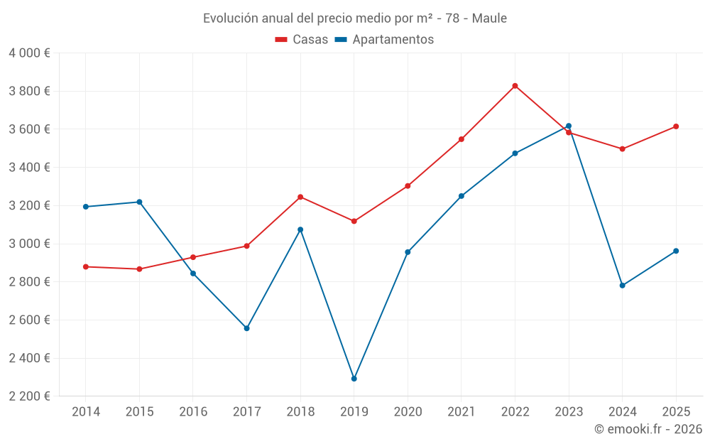 El precio mediano en las 16 transacciones de apartamentos de los últimos 24 meses en la comuna de Maule fue de 3 152 € por metro cuadrado para un valor patrimonial medio de 143 600 €. Durante este período el 60% de las transacciones estuvieron entre 2 484 y 4 565 € por metro cuadrado (del 2º al 8º decil).