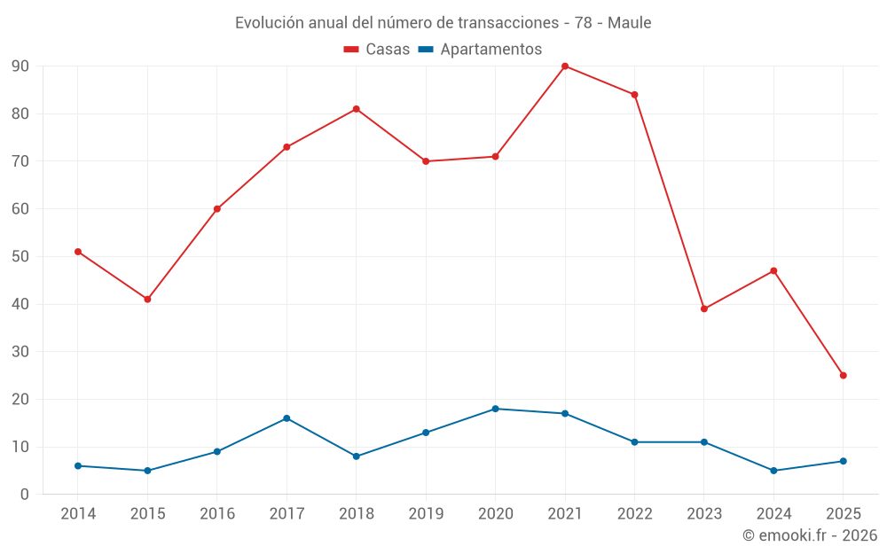 El precio mediano en las 25 transacciones de casas de los últimos 6 meses en la comuna de Maule fue de 3 615 € por metro cuadrado para un valor patrimonial medio de 345 000 €. Durante este período el 60% de las transacciones estuvieron entre 2 915 y 4 428 € por metro cuadrado (del 2º al 8º decil).