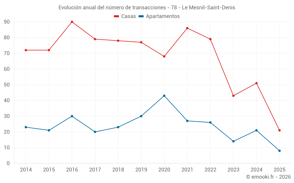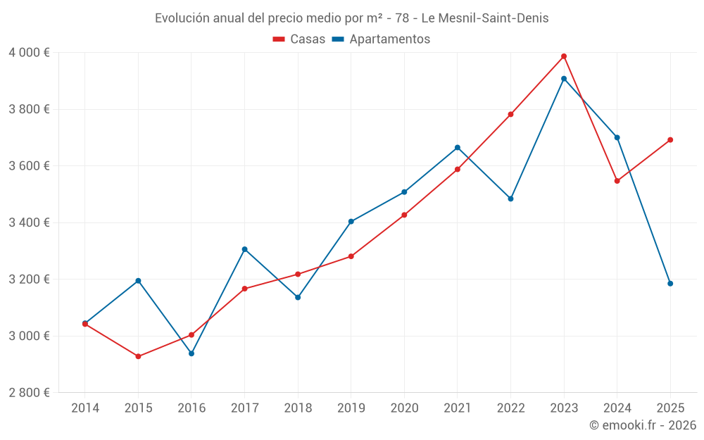 El precio mediano en las 21 transacciones de casas de los últimos 6 meses en la comuna de Le Mesnil-Saint-Denis fue de 3 692 € por metro cuadrado para un valor patrimonial medio de 435 170 €. Durante este período el 60% de las transacciones estuvieron entre 2 860 y 4 500 € por metro cuadrado (del 2º al 8º decil).