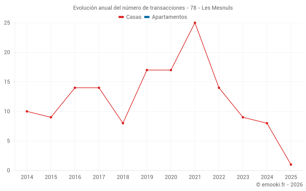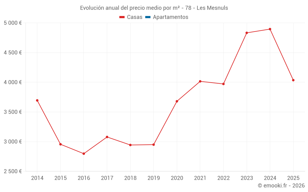 El precio mediano en las 14 transacciones de casas de los últimos 24 meses en la comuna de Les Mesnuls fue de 4 708 € por metro cuadrado para un valor patrimonial medio de 520 000 €. Durante este período el 60% de las transacciones estuvieron entre 4 115 y 5 018 € por metro cuadrado (del 2º al 8º decil).