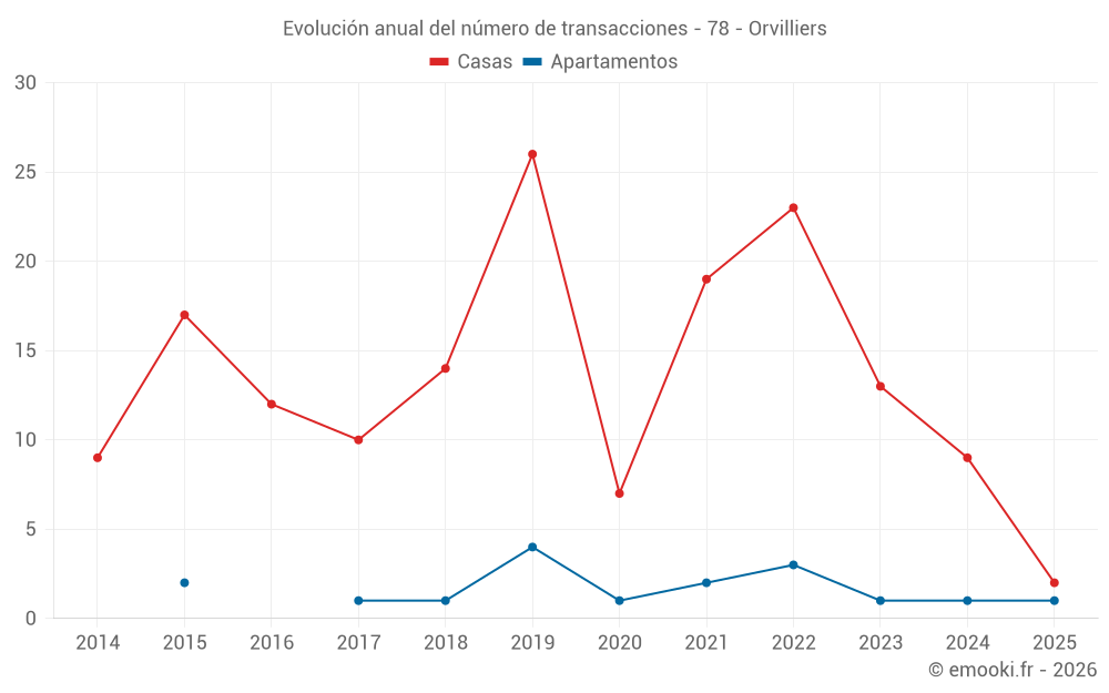 El precio mediano en las 19 transacciones de casas de los últimos 24 meses en la comuna de Orvilliers fue de 3 302 € por metro cuadrado para un valor patrimonial medio de 304 000 €. Durante este período el 60% de las transacciones estuvieron entre 2 892 y 4 065 € por metro cuadrado (del 2º al 8º decil).