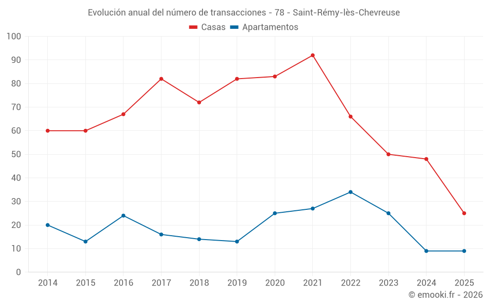 El precio mediano en las 25 transacciones de casas de los últimos 6 meses en la comuna de Saint-Rémy-lès-Chevreuse fue de 4 000 € por metro cuadrado para un valor patrimonial medio de 487 000 €. Durante este período el 60% de las transacciones estuvieron entre 3 390 y 4 360 € por metro cuadrado (del 2º al 8º decil).