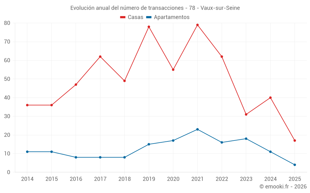 El precio mediano en las 24 transacciones de apartamentos de los últimos 24 meses en la comuna de Vaux-sur-Seine fue de 2 642 € por metro cuadrado para un valor patrimonial medio de 162 450 €. Durante este período el 60% de las transacciones estuvieron entre 1 983 y 3 535 € por metro cuadrado (del 2º al 8º decil).