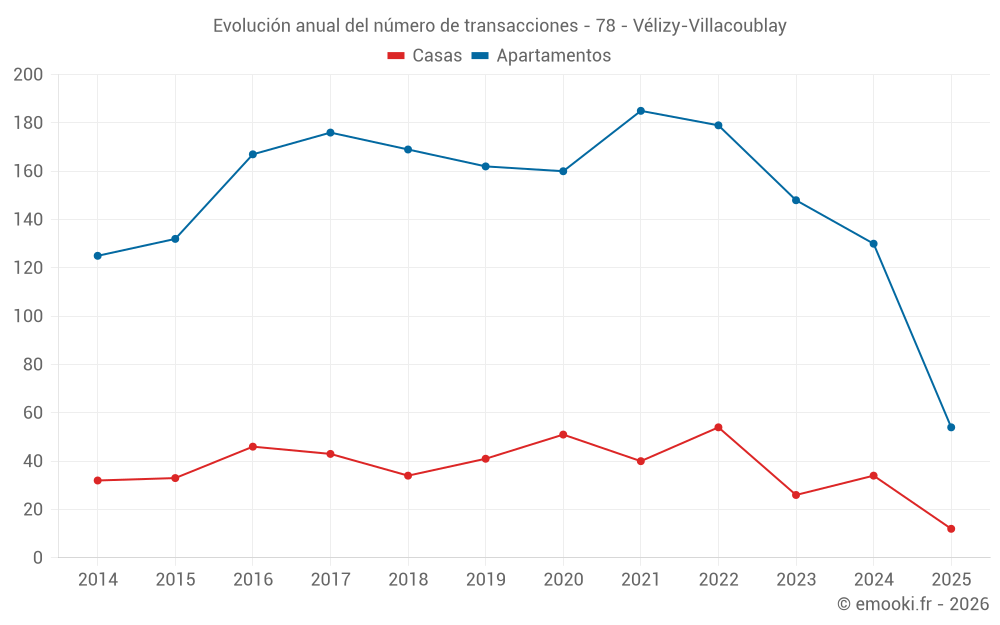 El precio mediano en las 54 transacciones de apartamentos de los últimos 6 meses en la comuna de Vélizy-Villacoublay fue de 4 072 € por metro cuadrado para un valor patrimonial medio de 282 875 €. Durante este período el 60% de las transacciones estuvieron entre 3 615 y 4 860 € por metro cuadrado (del 2º al 8º decil).