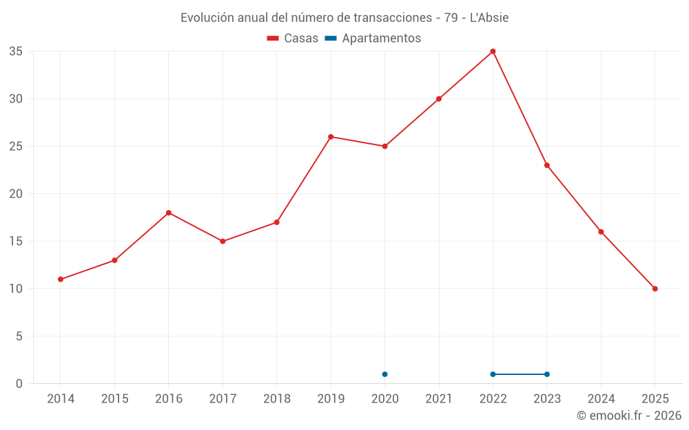 El precio mediano en las 16 transacciones de casas de los últimos 12 meses en la comuna de L'Absie fue de 932 € por metro cuadrado para un valor patrimonial medio de 91 075 €. Durante este período el 60% de las transacciones estuvieron entre 538 y 1 146 € por metro cuadrado (del 2º al 8º decil).