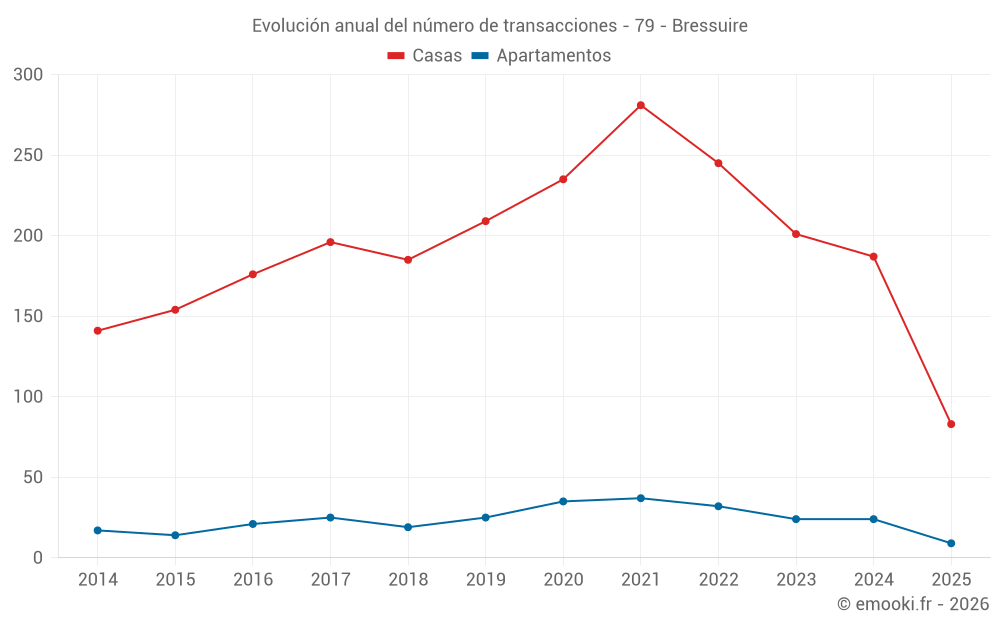 El precio mediano en las 23 transacciones de apartamentos de los últimos 12 meses en la comuna de Bressuire fue de 1 533 € por metro cuadrado para un valor patrimonial medio de 97 000 €. Durante este período el 60% de las transacciones estuvieron entre 1 281 y 1 776 € por metro cuadrado (del 2º al 8º decil).