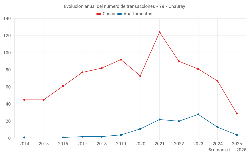 El precio mediano en las 29 transacciones de apartamentos de los últimos 24 meses en la comuna de Chauray fue de 2 091 € por metro cuadrado para un valor patrimonial medio de 104 500 €. Durante este período el 60% de las transacciones estuvieron entre 1 935 y 2 293 € por metro cuadrado (del 2º al 8º decil).