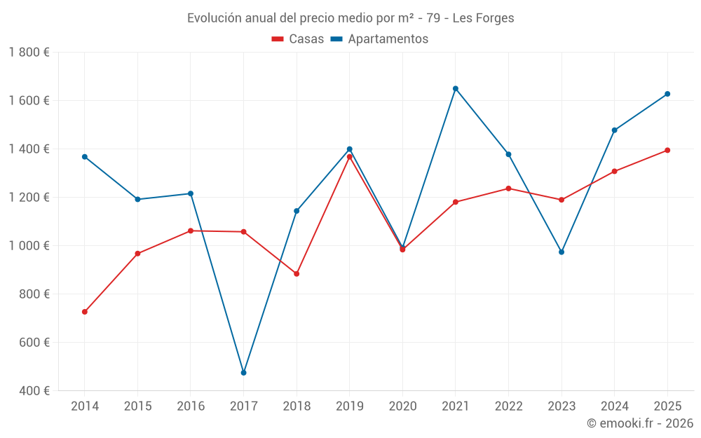 El precio mediano en las 27 transacciones de casas de los últimos 24 meses en la comuna de Les Forges fue de 1 286 € por metro cuadrado para un valor patrimonial medio de 116 600 €. Durante este período el 60% de las transacciones estuvieron entre 700 y 1 809 € por metro cuadrado (del 2º al 8º decil).