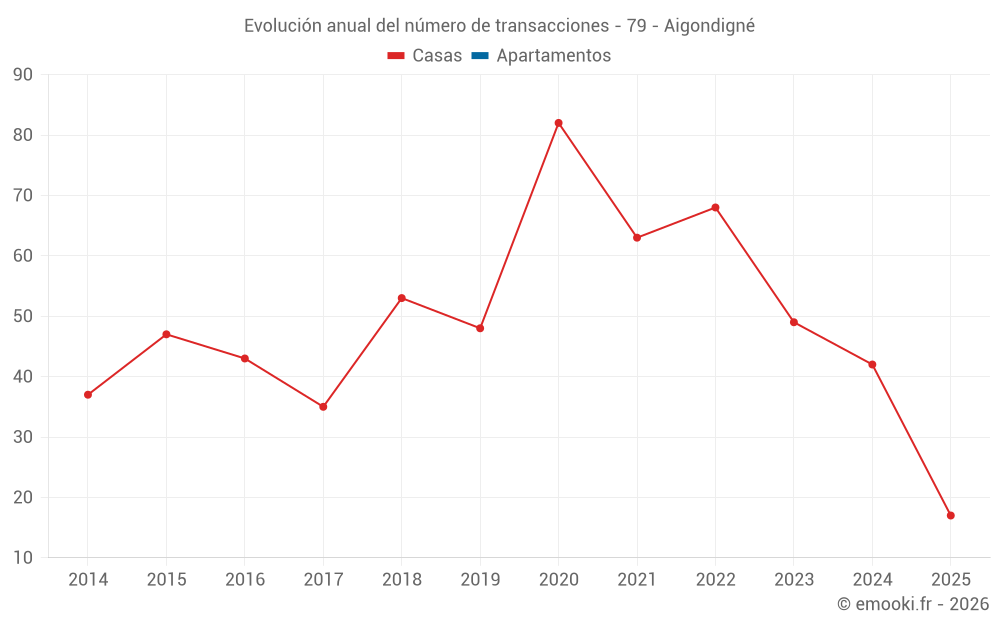 El precio mediano en las 43 transacciones de casas de los últimos 12 meses en la comuna de Aigondigné fue de 1 766 € por metro cuadrado para un valor patrimonial medio de 186 000 €. Durante este período el 60% de las transacciones estuvieron entre 1 185 y 2 071 € por metro cuadrado (del 2º al 8º decil).