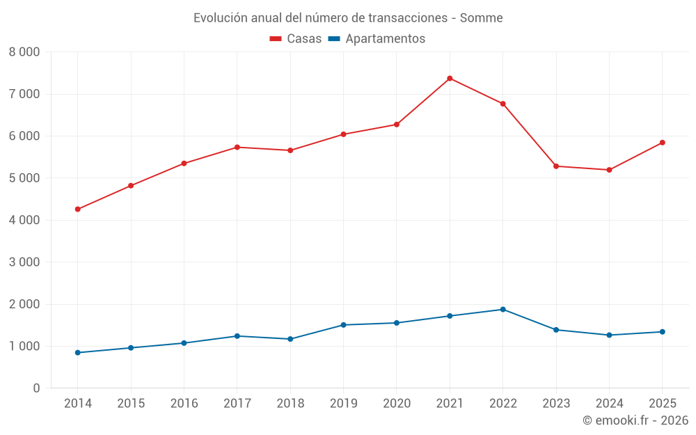 El precio mediano en las 1561 transacciones de casas de los últimos 3 meses en el departamento de Somme fue de 1 667 € por metro cuadrado para un valor patrimonial medio de 144 000 €. Durante este período el 60% de las transacciones estuvieron entre 1 037 y 2 410 € por metro cuadrado (del 2º al 8º decil).