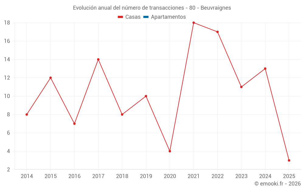 El precio mediano en las 20 transacciones de casas de los últimos 24 meses en la comuna de Beuvraignes fue de 1 362 € por metro cuadrado para un valor patrimonial medio de 133 550 €. Durante este período el 60% de las transacciones estuvieron entre 992 y 1 796 € por metro cuadrado (del 2º al 8º decil).