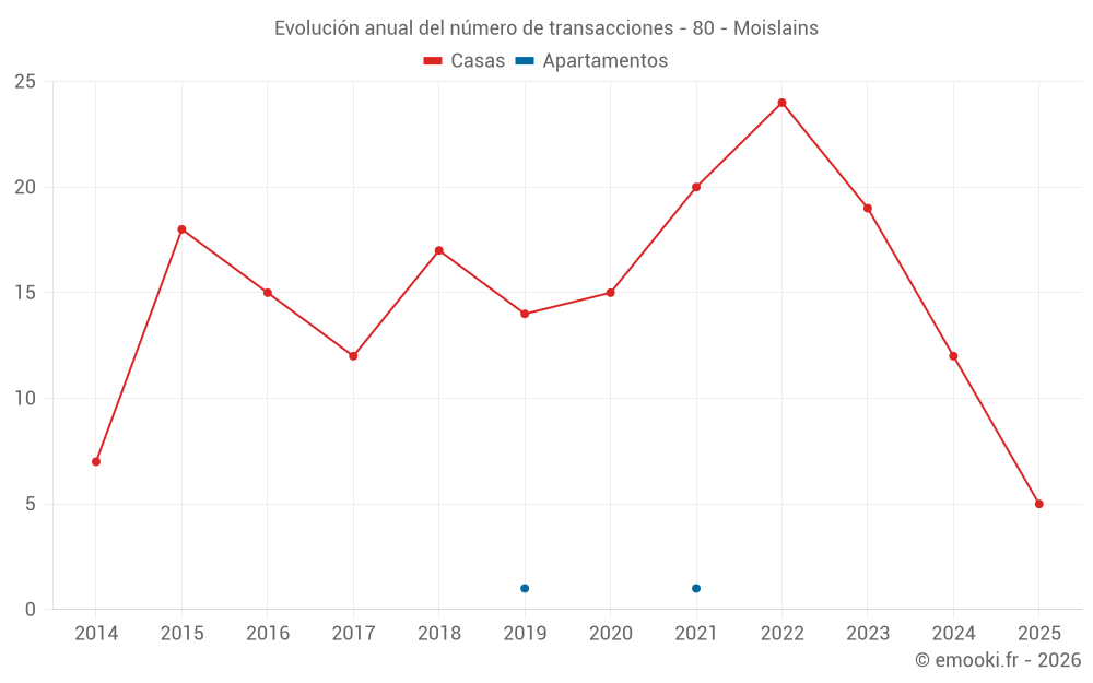 El precio mediano en las 29 transacciones de casas de los últimos 24 meses en la comuna de Moislains fue de 1 231 € por metro cuadrado para un valor patrimonial medio de 88 800 €. Durante este período el 60% de las transacciones estuvieron entre 728 y 1 686 € por metro cuadrado (del 2º al 8º decil).