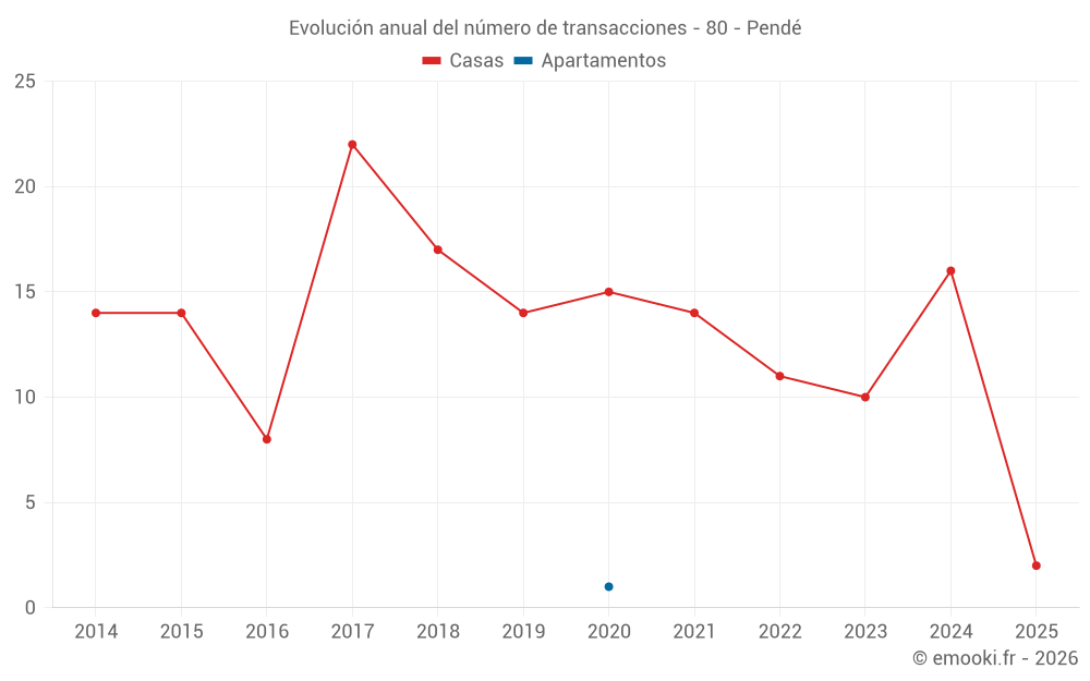 El precio mediano en las 23 transacciones de casas de los últimos 24 meses en la comuna de Pendé fue de 2 444 € por metro cuadrado para un valor patrimonial medio de 183 200 €. Durante este período el 60% de las transacciones estuvieron entre 1 512 y 3 158 € por metro cuadrado (del 2º al 8º decil).