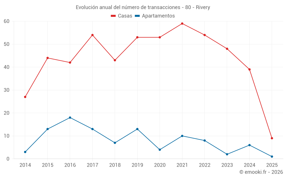 El precio mediano en las 32 transacciones de casas de los últimos 12 meses en la comuna de Rivery fue de 2 356 € por metro cuadrado para un valor patrimonial medio de 164 800 €. Durante este período el 60% de las transacciones estuvieron entre 1 884 y 2 785 € por metro cuadrado (del 2º al 8º decil).