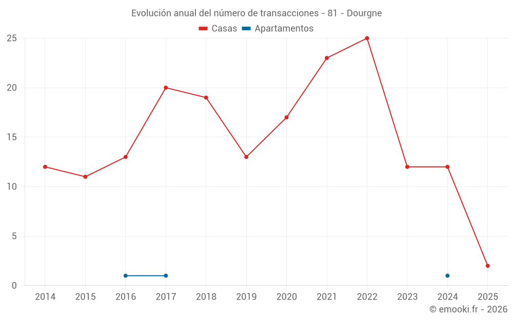 El precio mediano en las 19 transacciones de casas de los últimos 24 meses en la comuna de Dourgne fue de 1 331 € por metro cuadrado para un valor patrimonial medio de 127 000 €. Durante este período el 60% de las transacciones estuvieron entre 783 y 2 029 € por metro cuadrado (del 2º al 8º decil).