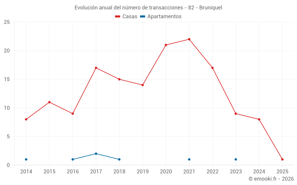 El precio mediano en las 14 transacciones de casas de los últimos 24 meses en la comuna de Bruniquel fue de 1 246 € por metro cuadrado para un valor patrimonial medio de 189 275 €. Durante este período el 60% de las transacciones estuvieron entre 602 y 2 173 € por metro cuadrado (del 2º al 8º decil).