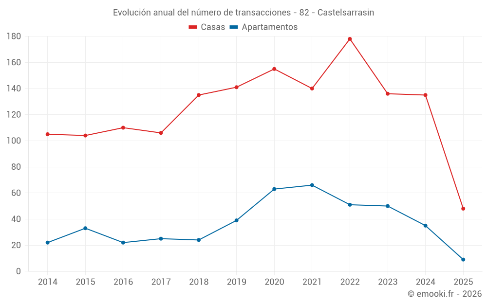 El precio mediano en las 48 transacciones de casas de los últimos 6 meses en la comuna de Castelsarrasin fue de 1 692 € por metro cuadrado para un valor patrimonial medio de 160 775 €. Durante este período el 60% de las transacciones estuvieron entre 1 304 y 2 119 € por metro cuadrado (del 2º al 8º decil).