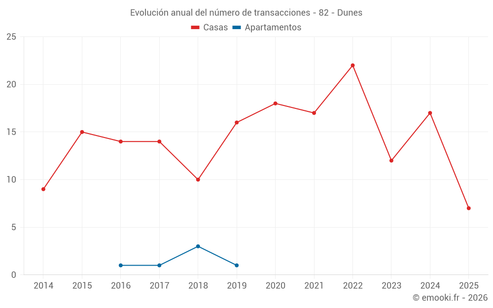El precio mediano en las 17 transacciones de casas de los últimos 12 meses en la comuna de Dunes fue de 1 340 € por metro cuadrado para un valor patrimonial medio de 176 128 €. Durante este período el 60% de las transacciones estuvieron entre 1 176 y 1 907 € por metro cuadrado (del 2º al 8º decil).
